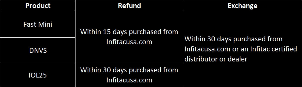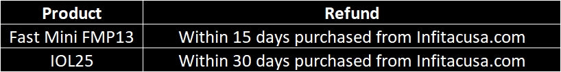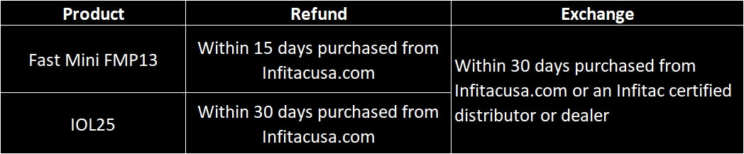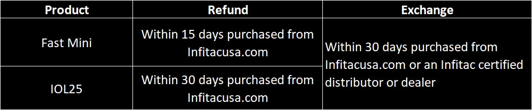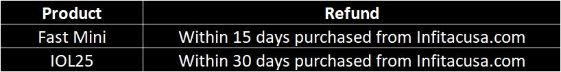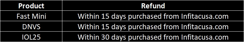 Refunds are only applicable to items purchased directly from infitacusa.com. We reserve the right to deny claim for return/refund if it is determined the unit does meet the requirements upon inspection. We will charge restocking fee of 15% (calculated on the total purchase) for a return or exchange not related to quality issues.