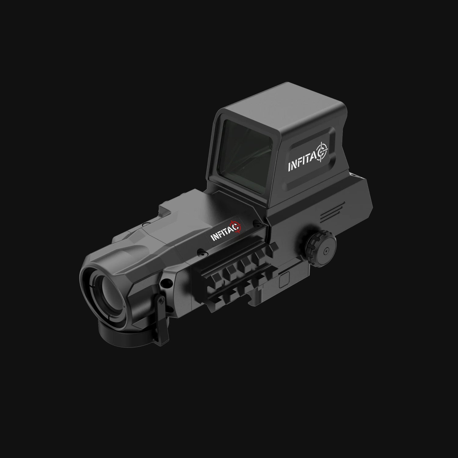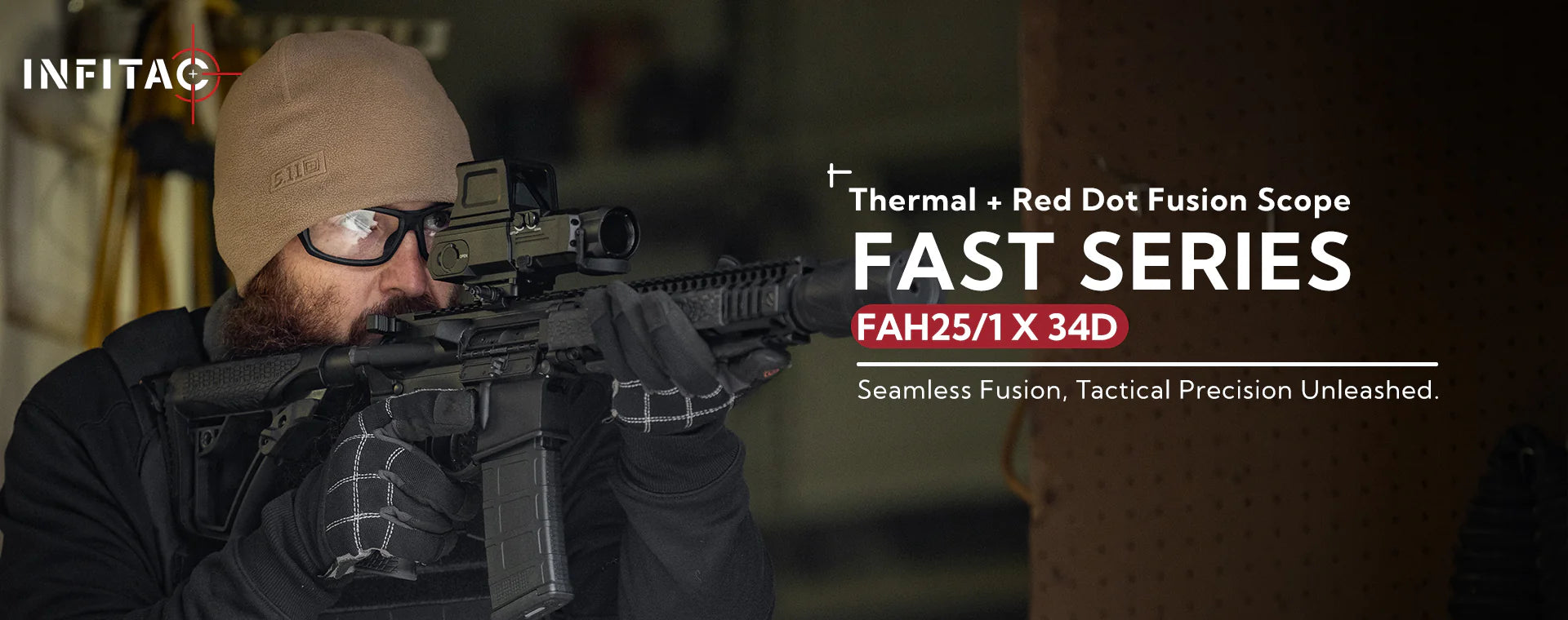 The INFITAC Fast Series scopes, models FAH25 and FAL19, merge thermal imaging with red dot. Both models operate at a 50Hz refresh rate, with the FAH25 featuring a 640×512 resolution thermal sensor and the FAL19 at 384×288. They include sharp 25mm and 19mm F1.0 lenses respectively. Built tough, each is IP67 waterproof and withstands up to 1200g of recoil.
